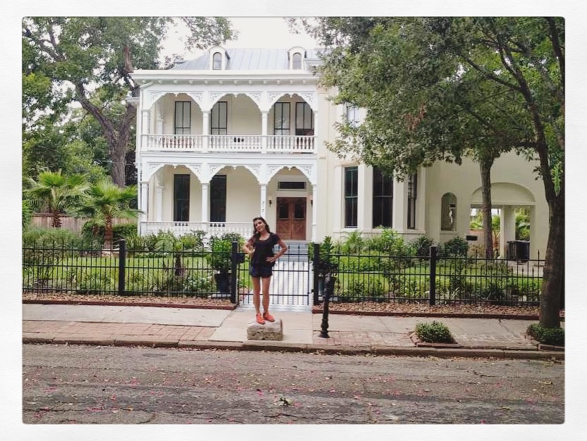 Sophia standing in front of a house in the King William district, pretending she lives there and just got off her horse.